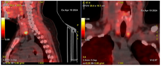 Figure 2. Whole-body 18F-Choline positron emission tomography/computed tomography (PET/CT) demonstrating hyperplasia of all four parathyroid glands, with the inferior glands, particularly the left one, exhibiting prominent size and metabolic activity.