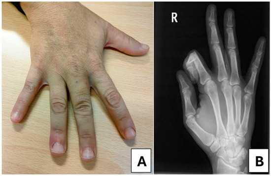 Figure 3. (A) Photograph of the right hand demonstrating the resolution of the calcified mass after treatment; (B) X-ray of the right hand showing the absence of calcifications and the full resolution of the condition.