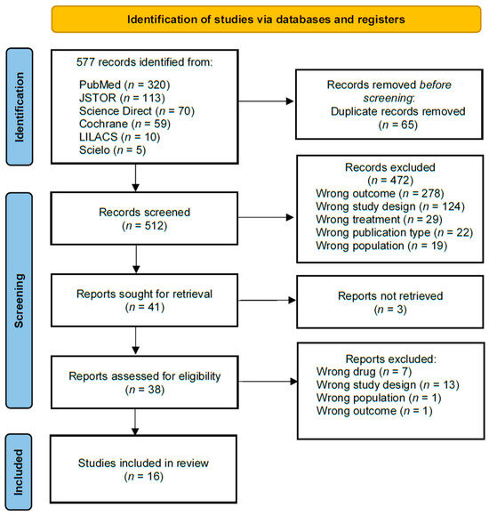 A search conducted on 8 August 2023, identified 577 records. After deduplication, 512 studies were screened by title and abstract. Of these, forty-one were retrieved, but three were unavailable. Full-text review of 38 studies led to the exclusion of 22, resulting in 16 studies for analysis. Figure 1 depicts the PRISMA flowchart [23] for study selection and provides the reasons for study exclusion.