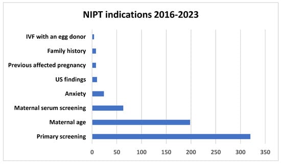 There was a remarkable rise in the demand for NIPT after 2021—63 women for 2016–2020 versus 572 for 2021–2023 (p < 0000.1, chi-square test) (Figure 1).