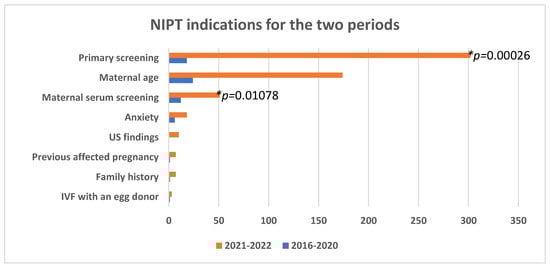 We compared the two periods to see if tendencies changed in time and with the decreased price for the test. During the first, more expensive period, women predominantly chose NIPT as a more sensitive test in cases of advanced maternal age (38.1%). Another 28.6% chose the test as a method for normal pregnancy follow-up. NIPT followed positive maternal serum screening in 19.1% of cases for this period. In 2021–2023, it was statistically significantly more commonly preferred for primary screening of normal pregnancy (52.8%) (p = 0.00026, chi-square test). Maternal age and positive serum screening represented 30.4% (p = 0.2113, chi-square test) and 8.9% (p = 0.01078, chi-square test), respectively (Figure 3). Of note, we labeled the indication as “Anxiety” in all cases of normal pregnancies where, regardless of young age (less than 35 years) and low risk from maternal serum screening, women still chose to undergo NIPT.