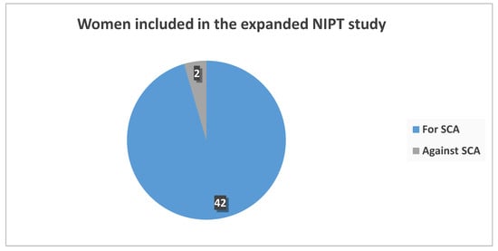 The selected group (n = 44) was offered NIPT with or without fetal sex and SCAs at the same price given the provider’s offer. The majority (95.5%, n = 42) preferred to include this information regardless of the indication for referral (Figure 4). Furthermore, all involved genetic counselors in the genetic center (n = 5); women, most of whom had one or more children before the age of 35, declared a personal preference for expanded NIPT. The latter information was not disclosed to the consulted women to preserve GC’s non-directive approach.