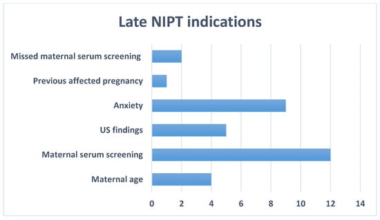 One of the known limitations of NIPT is the circulating free fetal fraction that requires performing it after the 10th gestational week []. However, late testing, performed near or after the latest possible time for invasive confirmatory testing, might also be problematic. In Bulgaria, amniocentesis is the most widespread and commonly preferred invasive technique for prenatal diagnosis, given its timing during pregnancy and its low risk for miscarriage []. Another issue would be the possible future of a late high-risk pregnancy. As discussed, outcomes depend on both families’ inclinations and the GW. Thus, only cases before the 20th week are applicable for confirmation and, eventually, TOP. Late NIPT was a relatively rare event in our center. The slow accumulation of such cases made us wonder about the tendencies in this small group, such as indications, panel choice, and results. As the significant indications for late NIPT do not differ significantly from the earlier ones (Figure 5), we may conclude that there is still a lack of widely available information about the possibilities of NIPT. Despite the scarceness of these cases, each one must be approached individually depending on the families’ indications, reproductive history, background, and cultural principles. Also, an explicit written recommendation for continuing pregnancy follow-up, including fetal morphology US, is fundamental.