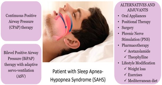 CPAP therapy alternatives and adjuvants for patients with SAHS. Abbreviations: SAHS—sleep apnea hypopnea syndrome, CPAP—continuous positive airway pressure, BiPaP—bilevel positive airway pressure, ASV—adaptive servo-ventilation, PNS—phrenic nerve stimulation. Figure created with BioRender. All credits to Aakash Mahato.