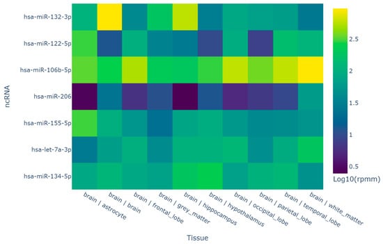 Six selected miRNAs—hsa-miR-134-5p, hsa-miR-106b-5p, hsa-miR-122-5p, hsa-miR-132-3p, hsa-miR-155-5p, and hsa-miR-206—were analyzed for tissue distribution. According to microRNA Tissue Atlas (https://ccb-web.cs.uni-saarland.de/tissueatlas2, accessed on 20 November 2024), selected microRNAs were highly enriched in many brain regions (Figure 1). In particular, these microRNAs were detected in the following: the brain, all lobes of the brain, the hippocampus, white matter, etc. Enrichment of the brain with the studied microRNAs allows for further analysis.