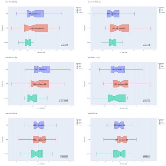 Expression of hsa-miR-134-5p microRNA significantly differentiates TLE from the control (l0f = 1.12, p = 0.002); hsa-miR-106b-5p allows discrimination of TLE from JME (l10f =−0.52, p = 0.023) and JME from the control (l10f = 0.75, p = 0.003); hsa-miR-122-5p differs in TLE groups compared to the control (l10f = 1.37, p = 0.00002) and JME compared to the control (l10f = 0.96, p = 0.020) and also TLE compared to JME (l10f = 0.41, p = 0.031); and hsa-miR-132-3p differs in TLE groups compared to JME (l10f = −0.44, p = 0.044) and JME compared to the control (l10f = 0.69, p = 0.004). Plots describing significantly changed expressions between TLE and JME are exhibited in Figure 4.