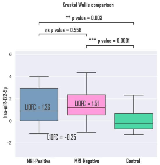 Expression of hsa-miR-122-5p microRNA in MRI-positive and MRI-negative patients compared to controls. **—p value < 0.01, ***—p value < 0.001.