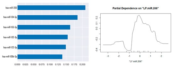 Also, using machine learning algorithms (the training dataset includes classic 0.2 of the full one), a Random Forest classification model was created, as well as identifying factors that have the greatest impact on classification. The most significant factor for classifying patients as MRI-positive and MRI-negative was the expression of hsa-miR-206-5p, but with a low accuracy value of 0.25. The partial dependence graph demonstrates an increase in the expression of hsa-miR-206 for a group of patients with hippocampal sclerosis (Figure 6).