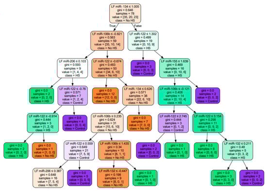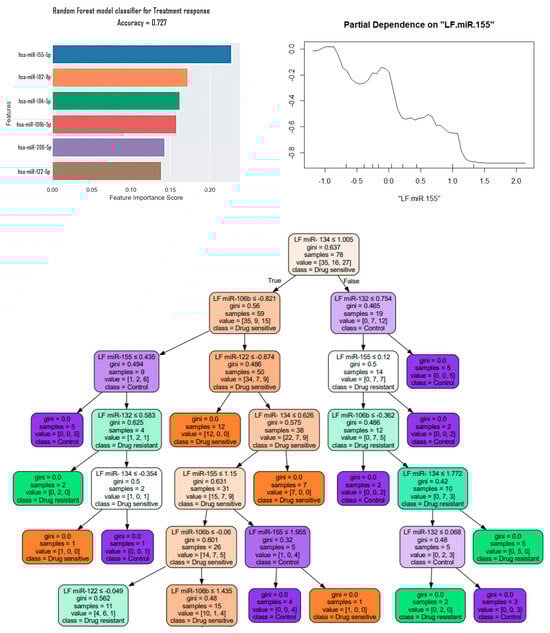 A Random Forest and decision tree model were also created to classify the data and identify the factors that have the greatest impact on classification (Figure 9). The most significant factor for classifying drug-sensitive and drug-resistant patients was the expression of hsa-miR-155-5p with an accuracy of 0.73. The partial dependence plot demonstrates a characteristic decrease in hsa-miR-155-5p expression for the DR group of patients. L10fc for DR patients in comparison with DS patients was −0.499 but the p value was near 0.05. The studied samples were of different sizes, which is a limitation, therefore the presence or absence of statistically significant differences may be a consequence of this limitation.