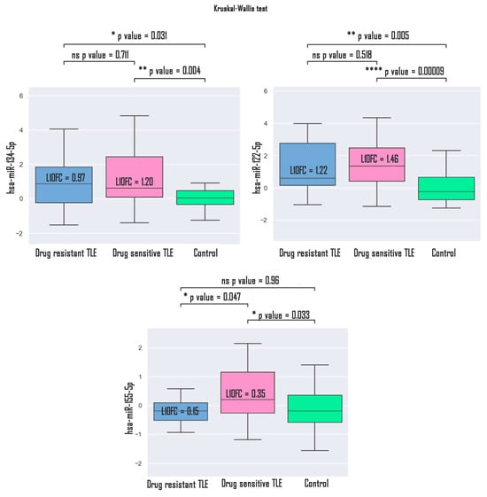 Within the group of patients with TLE, plasma expression of miRNAs was compared in MRI-positive (presence of hippocampal sclerosis, n = 25) patients and MRI-negative (absence of hippocampal sclerosis, n = 27) patients, as well as in the controls. The analysis demonstrated statistically significant differences between the MRI-positive groups and the controls, and MRI-negative groups and the controls. No statistically significant differences were found between the MRI-positive and MRI-negative groups (Figure 5).