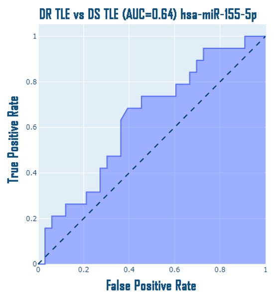 Interestingly, the obtained data are confirmed by the conducted ROC analysis, classifying drug-resistant and drug-sensitive patients with TLE based on the expression data of hsa-miR-155-5p microRNA, in particular, AUC = 0.67 with CI [0.49; 0.79] (Figure 10); however, an attempt to discriminate these groups by other microRNAs does not allow this to be achieved: hsa-miR-134-5p: AUC = 0.53, CI [0.30; 0.64], hsa-miR-106b-5p: AUC = 0.50, CI [0.34; 0.66], hsa-miR-122-5p: AUC = 0.55, CI [0.28; 0.61], hsa-miR-132-3p: AUC = 0.54, CI [0.26; 0.62], hsa-miR-206-5p: AUC = 0.51, CI [0.35; 0.67].