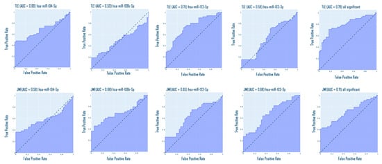 hsa-miR-122-5p has not been previously studied in the context of epilepsy. However, it has been associated with acute cerebral events such as stroke [,], as well as Alzheimer’s disease []. There is evidence that hsa-miR-122-5p is associated with the FOXO3 gene and exerts a neuroprotective effect through the induction of the NF-κB cascade [], which may be a compensatory response to seizure activity. In vitro data demonstrated that hsa-miR-122-5p was able to upregulate inflammatory factors and lead to microglial activation via targeting MLLT1 and inhibiting the PI3K/AKT pathway []. If we take into account the hypothesis of neuroinflammation induction, it is known that neuroinflammation is not a process specific to a particular epileptic syndrome [], but is, in general, a process that characterizes epileptogenesis; therefore, significantly increased expression of this microRNA can be characteristic of both TLE and JME. Nevertheless, our data on the expression of hsa-miR-122-5p allow us not only to discriminate the pathological phenotype from the control, but also to demarcate between different forms of epilepsy.