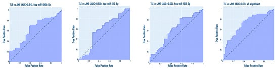Also, additional ROC analysis was performed for TLE and JME groups based on the expression data of significantly different microRNAs: hsa-miR-106b-5p, hsa-miR-122-5p, and has-miR-132-3p. hsa-miR-106b-5p allows differentiating TLE versus JME: AUC = 0.64, CI [0.26; 0.49]. hsa-miR-122-5p allows differentiating TLE versus JME: AUC = 0.58, CI [0.48; 0.72]. hsa-miR-132-3p allows differentiating TLE versus JME: AUC = 0.62, CI [0.27; 0.49]. The fusion of both microRNAs demonstrated AUC = 0.71 (Figure 14). Additionally, we performed ROC analysis for the remaining microRNAs: hsa-miR-134-5p: AUC = 0.55, CI [0.43; 0.67]; hsa-miR-155-5p: AUC = 0.51, CI [0.38; 0.61]; hsa-miR-206-5p: AUC = 0.57, CI [0.32; 0.55].