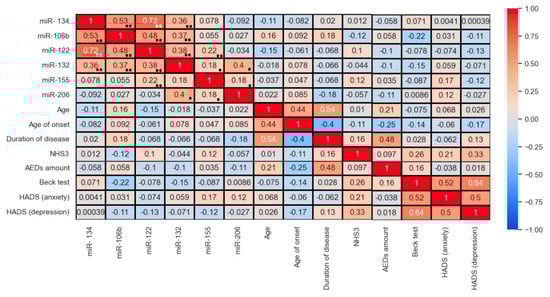 Analysis of data correlations demonstrated the presence of statistically significant correlations between the expression of various microRNAs. However, statistically significant correlations between microRNA expression and clinical characteristics of patients, such as age of onset, duration of the disease, and test scores, were not revealed (Figure 15).