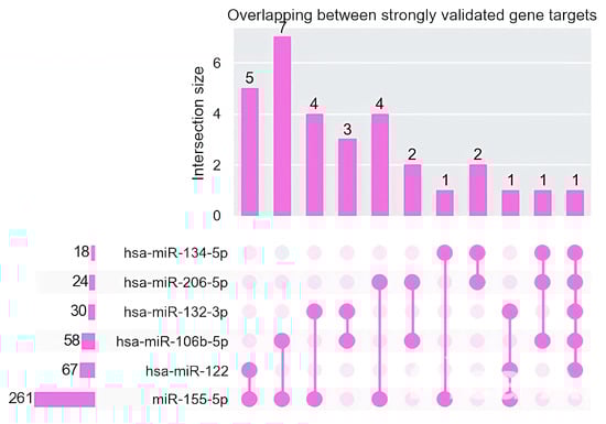 For each of the studied miRNAs, gene targets obtained from the miRtaRBase database with three strong validations (qPCR, Reporter assay, Western blot) were examined. An analysis of the presence of intersections between the gene targets of these miRNAs was performed, which demonstrated the presence of intersections (Figure 16).