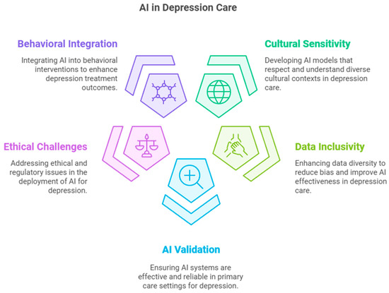 | Cultural Variability in Depression Care | Cultural differences in mental health perceptions, including depression symptoms such as somatic manifestations, limit the applicability of standardized AI tools. | Collaborate with local stakeholders to tailor AI tools to culturally specific needs and manifestations of depression. |