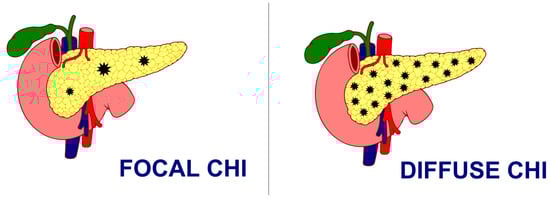 Histologically, CHI has been classified as either a focal form with the involvement of a small area of islet cell expansion and minimal exocrine tissue involvement or a diffuse form involving the entire pancreas and nucleomegaly of some islet cells or atypical forms with a combination of both focal and diffuse lesions [] (Figure 1). While the management of CHI includes nutritional, medical, and surgical intervention depending on the underlying histologic and genetic subtype, focal lesionectomy is the preferred curative treatment for focal CHI when a complete resection is achieved. But the management of diffuse lesions, which account for the majority of the cases, still poses a significant challenge with near-total-pancreatectomy, i.e., resection of 95–98% of pancreatic tissue as a last resort in preventing hypoglycaemic brain damage, especially in severe cases where sufficient glycaemic control cannot be achieved, even though the combination of different medications and nutritional supplements poses a persistent risk of hypoglycaemia and subsequent neurodevelopmental delay [,,]. However, even surgical interventions with near-total-pancreatectomy have been proven to be not curative in such patients, with often inconsistent and unsatisfactory outcomes, ranging from persisting hypoglycaemia (up to 60%), hyperglycaemia (almost 100% at 11 years post-surgery), and exocrine pancreatic insufficiency (almost 50%) []. Moreover, almost 96% of the patients reported the incidence of insulin-dependent diabetes mellitus 10–15 years after near-total-pancreatectomy, 77% after 7 years, and 13% soon after surgery [].