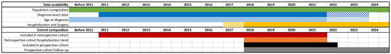 Figure 1. Gantt chart of data availability and cohort composition timelines. Shaded areas indicate incomplete or partial data coverage for the year.