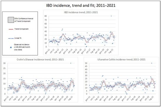 Figure 2. IBD monthly incidence (×100,000 ppl) with trend component (with 95% Confidence Interval) and linear fit; 2011–2021.