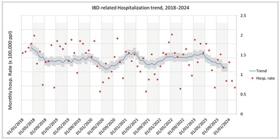 The monthly hospitalisation trend among the cohort of IBD patients residing in Roma 1 (N = 2191) was calculated from January 2018 to May 2024 using time series decomposition, as per primary analysis. The hospitalisation trend was also described as a yearly percentage among IBD patients.