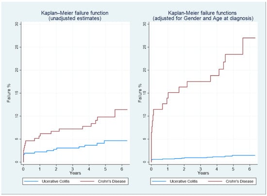 Figure 5. Kaplan–Meier failure functions for Ulcerative Colitis (UC) and Crohn’s Disease (CD) patients, raw data (left), and adjusted for age at diagnosis and gender (right). The outcome of interest is the first occurrence of surgery.