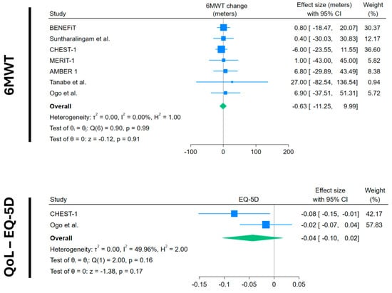 Forest plots of 6MWT and quality of life change in placebo arms. Blue squares with lines represent individual study effect sizes with 95% confidence intervals; square size reflects study weight. The green diamond indicates the pooled effect size and its 95% confidence interval. Studies included with their references: BENEFiT [14]; Suntharalingam et al. [15]; CHEST-1 [7]; MERIT-1 [8]; AMBER 1 [16]; Tanabe et al. [17]; Ogo et al. [18].