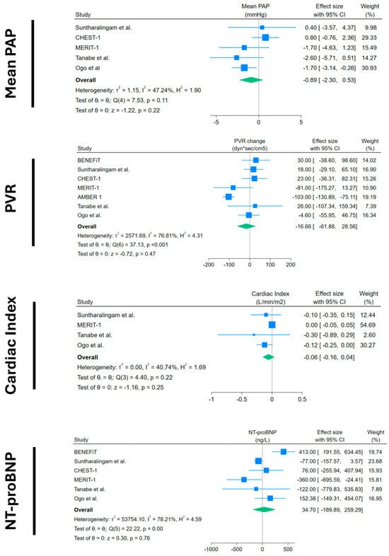 Forest plots of mPAP, PVR, cardiac index, and NT-proBNP change in placebo arms. Blue squares with lines represent individual study effect sizes with 95% confidence intervals; square size reflects study weight. The green diamond indicates the pooled effect size and its 95% confidence interval. Studies included with their references: BENEFiT [14]; Suntharalingam et al. [15]; CHEST-1 [7]; MERIT-1 [8]; AMBER 1 [16]; Tanabe et al. [17]; Ogo et al. [18].