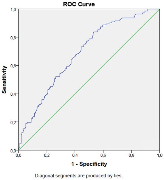 The sensitivity and specificity of the prognostic nutritional index for predicting mortality (cut-off value < 34.2%) were 73% and 56%, respectively (AUC = 0.69, p < 0.001; 95% CI: 0.64–0.74). Figure 2 presents the ROC curve for the PNI in detecting mortality.
