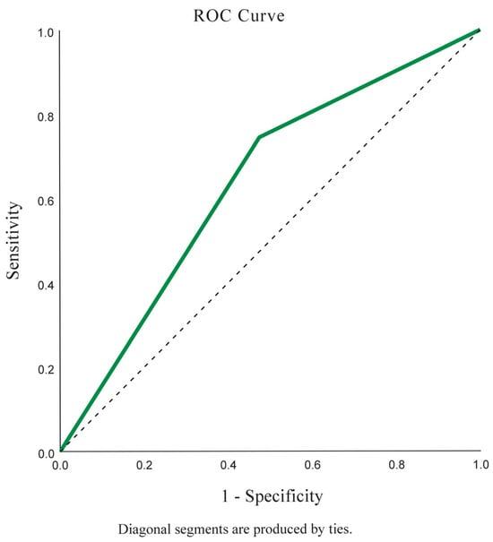 The ROC analysis assessing facial melasma as a predictor of nuclear cataracts yielded an Area Under the Curve of 0.635 (95% CI, 0.578–0.693), indicating fair discriminatory ability (Figure 1). The model demonstrated a sensitivity of 74.54%, specificity of 52.53%, and Youden index of 0.27, indicating good detection capability but a moderate false-positive rate. The positive predictive value was 77.4%, while the negative predictive value was 48.6%.