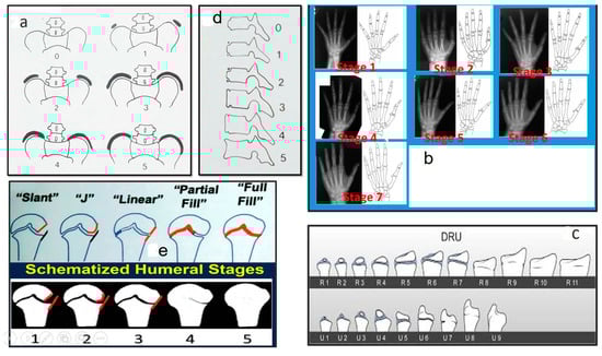 The various employed methods/techniques to evaluate the level of skeletal maturity, modified from original published figures (as modified from [25,26,27,28,29,30]). (a) Risser’s method, known as Risser sign, (b) Sanders maturity score system, (c) distal radius and ulna (DRU) classification, (d) ossification of the vertebral epiphyseal rings, (e) ossification of the humeral head.