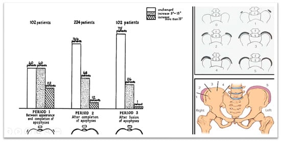 Zaoussis and James (1958) carried out a study investigating the radiographic characteristics of the ossification center in the iliac apophysis and its correlation with other indicators of maturation, including the onset of menstruation and the formation of vertebral body apophyses in relation to scoliosis curve progression. This study was the first to present statistical evidence demonstrating that skeletal maturation, marked by the complete development of the iliac apophysis, signifies the conclusion of substantial scoliosis progression (Figure 3, [31]).