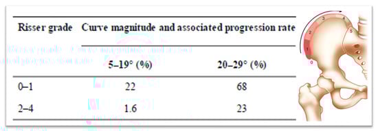 The likelihood of curve progression by the Risser sign grade and curve magnitude (as modified from [32]).