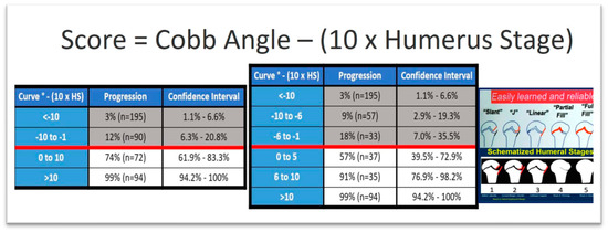 The proximal humeral ossification system provides a reliable method for estimating Peak Height Velocity (PHV) in individuals with IS using standard spine radiographs, thus removing the need for separate hand radiographs to assess bone age. This method improves the precision of maturity predictions, enabling healthcare providers to more accurately assess a patient’s skeletal maturity in relation to PHV. As a result, it supports more informed treatment decisions while minimizing additional radiation exposure, time, and costs. Assessing the proximal humeral physis in spine radiographs that include the shoulder serves as a practical and valuable tool for determining skeletal maturity in adolescents with IS; also, it was reported that the humeral head classification system showed a strong relationship with age at PHV and the remaining growth percentage. Furthermore, the staging system demonstrated excellent reliability in both inter-observer and intra-observer assessments, suggesting its broad applicability [33]. Additionally, Li et al. (2018), presented a formula to assess the progression to a surgical range of an AIS curve and the score is calculated by subtracting from the Cobb angle the tenfold stage of ossification of the humeral head, as shown in Figure 5 [33].