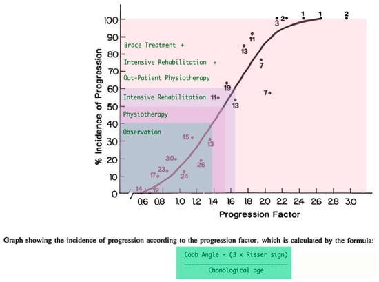 In 1984, Lonstein and Carlson presented research on the probability of curve progression in untreated AIS during growth, considering the Risser sign grade and curve severity (Figure 4, [32]).