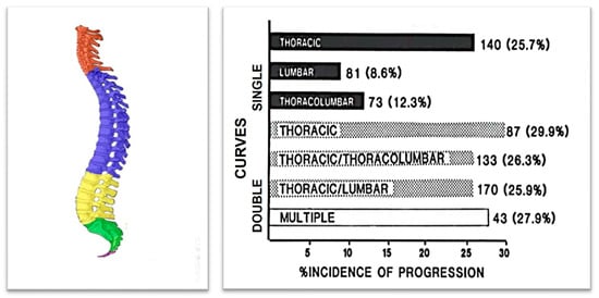 The Iowa study, which originated from research on school scoliosis screening in children, is regarded as a foundational study in understanding the progression of AIS and in developing the first predictive model for its progression. Figure 10 illustrates the incidence of progression for each curve pattern. The numbers to the right of the bars represent the number of patients with each pattern, while the numbers in parentheses indicate the percentage of cases that progressed [32]. Predictors of AIS curve progression have been found to include curve pattern and magnitude, the patient’s age at presentation, Risser sign, and menarchial status.