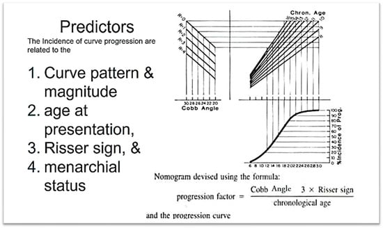 The factors typically suggested in clinical practice to predict curve progression and guide appropriate treatment for AIS are as follows: 1. age at diagnosis, 2. sex, 3. magnitude of the curve, 4. growth potential, 5. curve type, 6. curve location and Cobb angle, 7. menstrual status (for females), 8. curve pattern (single vs. double curves), and 10. family history. These represent predictors for progression of AIS patients undergoing brace treatment [54,55].