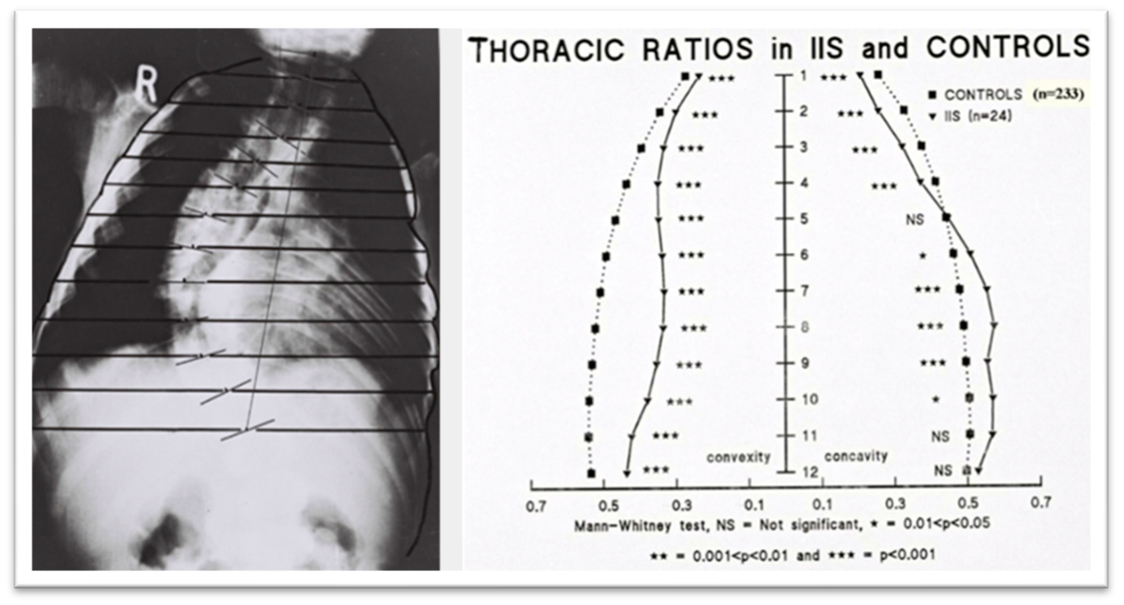 The thoracic ratios for the sample of patients with IIS compared with controls. The comparison shows that the scoliotic thorax is significantly narrower than that of the controls at all spinal levels (modified from [45]).