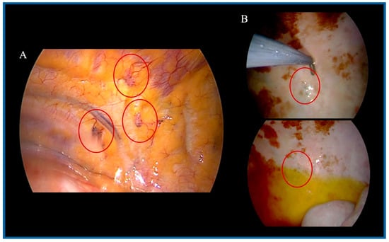Surgical views. (A): First PITAC: pleural disease with visible lesions (circled). (B): Second PITAC: fibrotic areas and new biopsies; prior biopsy sites marked with titanium clips (circled).