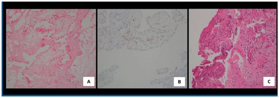 In February 2022, the patient underwent the first PITAC procedure without perioperative complications (Figure 3A). Titanium clips were placed at the biopsy sites during surgery to facilitate future localization. The postoperative course was uneventful, and the patient was discharged on postoperative day 4. Histopathological examination of pleural biopsies confirmed the diagnosis of mesothelioma in situ, with immunohistochemistry (IHC) positive for CKpan, calretinin, podoplanin, and WT-1, and negative for BAP1, Ber-EP4, and TTF-1 (Figure 4A,B). Due to underlying renal insufficiency, systemic CHT was not administered. PITAC was effective in achieving pleurodesis and local disease control for nine months.