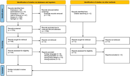 A systematic search was conducted across six databases and yielded a total of 1892 studies. After electronically detecting and excluding 118 duplicates, the screening process advanced to reviewing titles and abstracts, which narrowed down the studies for further inclusion. Following an assessment of 44 studies, 5 studies (published in 2010–2023) were included in this systematic review [6,7,10,11,12]. Details regarding study selection and reason of exclusion are presented in the PRISMA flow diagram (Figure 1).