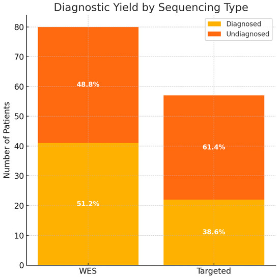Sequencing was conducted using hybridization-based capture and Illumina technology. Quality metrics ensured high coverage and reliable variant detection. Bioinformatics analysis included alignment to the GRCh37/hg19 reference genome, variant calling, annotation, and classification according to ACMG/AMP guidelines [8]. Public databases (e.g., ClinVar and gnomAD), in silico prediction tools, and the relevant literature were also consulted to support the classification of the reported variants [9,10]. The variants were categorized as pathogenic, likely pathogenic, variants of uncertain significance (VUSs), or benign. Only the pathogenic and likely pathogenic variants were included in the calculation of the diagnostic yield. The detected variants were further described by molecular type (e.g., missense, nonsense, frameshift, copy number variation (CNV), splice site, and in-frame indels), inheritance pattern, and novelty status (novel vs. reported). Descriptive statistics were used to summarize the patient characteristics and variant classifications. Chi-square tests were used to assess differences in diagnostic yield based on the sequencing method (WES vs. targeted) and the clinical phenotype group. Statistical analyses were conducted using IBM SPSS Statistics (version 26), and p-values < 0.05 were considered statistically significant. All numbers other than the p-values were rounded to one decimal place.