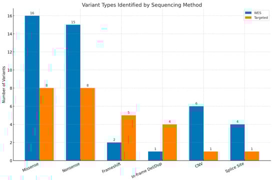 Among the 63 patients with pathogenic or likely pathogenic variants, 56 (88.9%) were diagnosed with Single-Nucleotide Variants (SNVs)/insertions or deletions (INDELs) and 7 (11.1%) were diagnosed with CNVs. The most frequently observed variants were missense mutations, identified in 16 WES cases and 8 targeted cases, followed by nonsense (stop-gained) variants (15 WES cases and 8 targeted cases). Figure 3 presents the distribution of the detected variants.