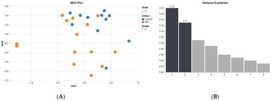 (A) Multidimensional scaling clustering of samples. (B) Bar plot to visualize the amount of variance explained by each component.