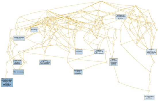 The gene ontology term enrichment results were further post-processed to reduce redundancy using the Affinity propagation method. This resulted in a gene network that included terms such as regulation of immune system processes, autophagy, RNA splicing, and RIG-1 signaling (Figure 5). The maximum number of genes in a cluster was 2000, and the minimum was 5. Clusters with FDR < 0.05 were considered significant.