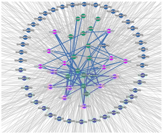 For the entire pool of genes of interest, a microRNA–Gene Targets interaction network was constructed. The analysis included microRNAs from databases containing predicted microRNA target genes with FDR < 0.05. The reduced network is shown in Figure 7. MicroRNAs interacting with a smaller proportion of target genes were trimmed.