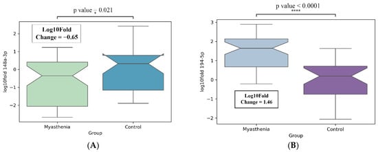 After removing outliers using the Grubbs test, the myasthenia group included 49 participants, the control group 31 participants. The analysis revealed a statistically significant increase in hsa-miR-194-5p expression: Log10 Fold Change (L10FC) = 1.46, p-value < 0.0001, 95% CI [−6.3600; −3.2750], test power was 0.99, as well as a statistically significant decrease in hsa-miR-148a-3p expression: L10FC = −0.65, p-value = 0.02, 95% CI [0.36; 3.63], test power = 0.71; required sample sizes for group = 49 and 31. p-value was adjusted with Bonferroni correction.