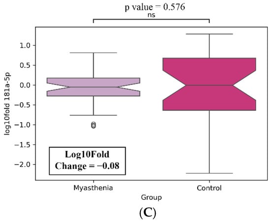 MicroRNA expression in patients with myasthenia (n = 49) compared to controls (n = 31). (A) hsa-miR-148a-3p; (B) hsa-miR-194-5p; (C) hsa-miR-181a-5p. * p-value < 0.05; **** p-value < 0.0001; ns-non significant.