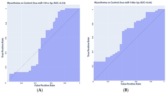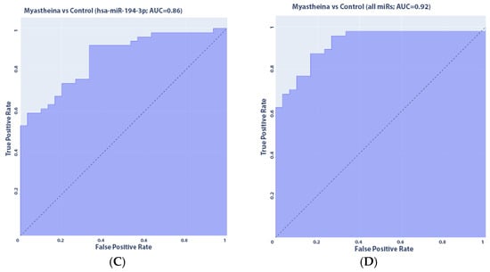 Thus, in particular, for hsa-miR-148a-3p, AUC was equal to 0.66, for hsa-miR-194-5p AUC = 0.86, which characterizes the expression of this microRNA as a good biomarker for discrimination of myasthenia. For hsa-miR-181a-5p, AUC = 0.54, which demonstrates the unsuitability of its use in discrimination. All ROC curves are presented in Figure 9. Also, we additionally constructed a ROC curve for all microRNAs; its AUC = 0.92.