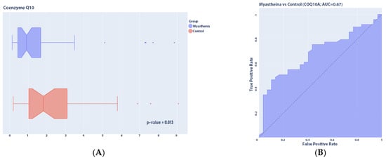 COQ10A concentration in plasma of patients with myasthenia (n = 49) compared to controls (n = 31). (A) Distribution of concentrations; (B) ROC (receiver operating characteristic) curve.