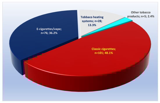 When analyzed according to the answers to the question “What tobacco products do you mostly use at the moment?”, active smokers most often (48.1%) indicated classic cigarettes, followed by tobacco heating systems with 36.2% and electronic cigarettes/vape with 13.3%, and only 2.4% of the respondents indicated other methods of tobacco product use (Figure 1). There were no significant differences in the indicated main use of tobacco products in a comparative analysis between Bulgarian and foreign students (Supplementary Table S9). On the other hand, when the two sexes were analyzed, there were significantly more females in the entire sample who mostly used tobacco heating systems, which turned out to be almost twice as popular amongst them—at 44.9%, compared to 25.3% in men (p = 0.004). Conversely, the use of “Classic cigarettes” was more common among men—at 58.2%, compared to 40.7% of women, with p = 0.012 (Supplementary Table S10).